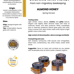 Our non-migratory honeybees keep boosting biodiversity permanently for an outstanding rich soil ecosystem. This Regenerative Organic beekeeping project neither exploit, nor feed honeybees with artificial fed, our main goal is boosting biodiveristy in this territory, and this is why we do not migrate colonies. The outcome is a very small but extraordinary honey quality of a high content of almond pollen.