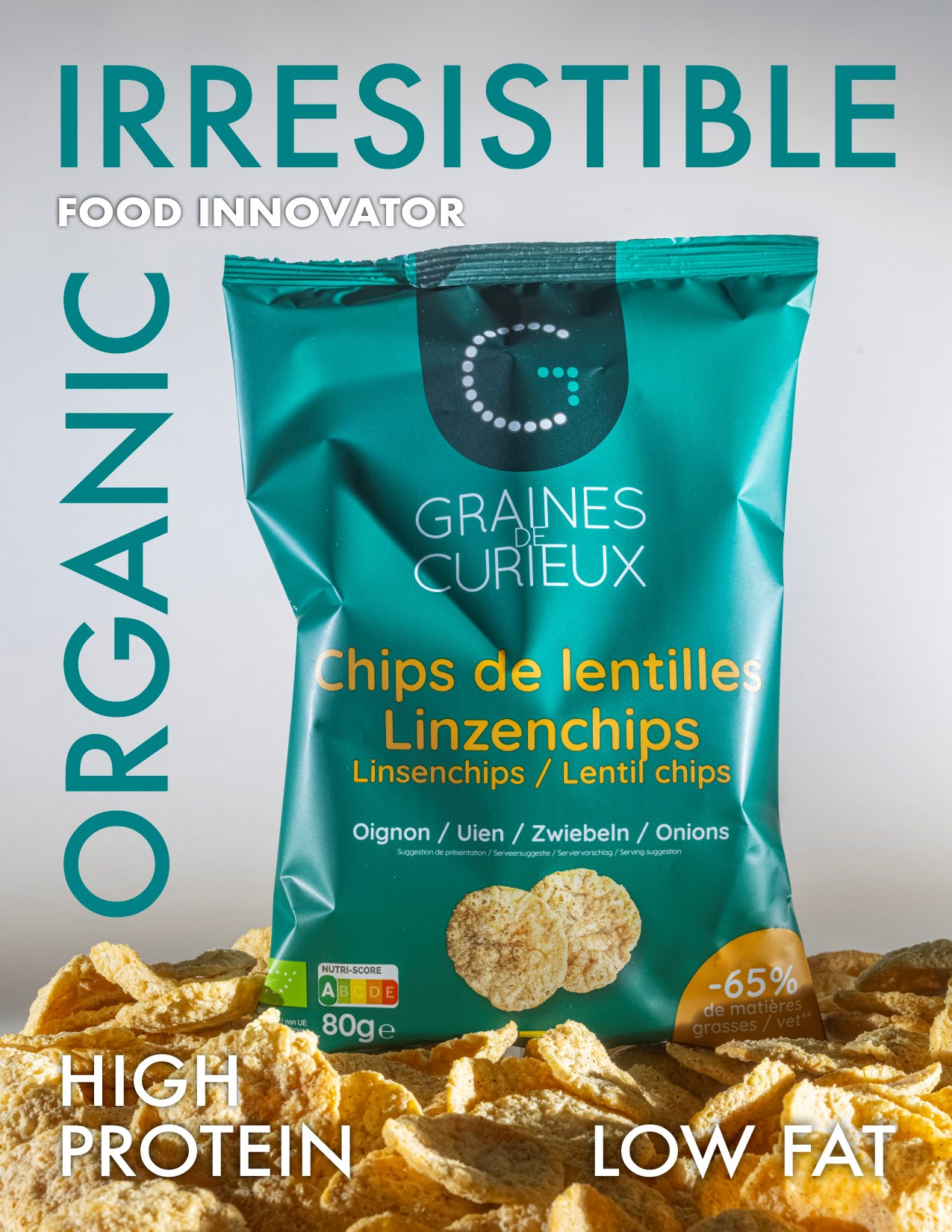 - Élaborées à base de lentilles, elles sont sources de protéines et de fibres, ce qui correspond aux attentes des consommateurs en quête de snacks plus rassasiants et plus équilibrés que les chips de pomme de terre