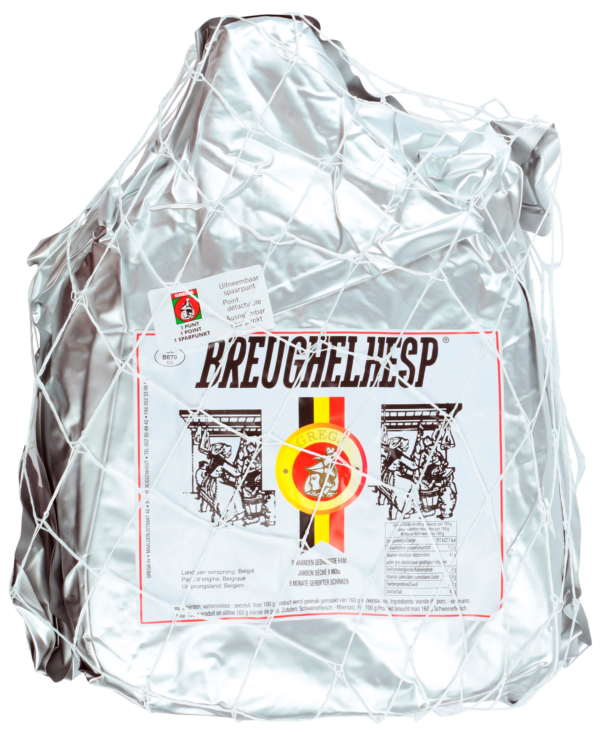 Le jambon Breughel du producteur Belge GREGA (Buggenhout, Flandre-Orientale), affiné 9 mois minimum, au goût un peu salé, se réfère au véritable jambon de campagne d'antan.