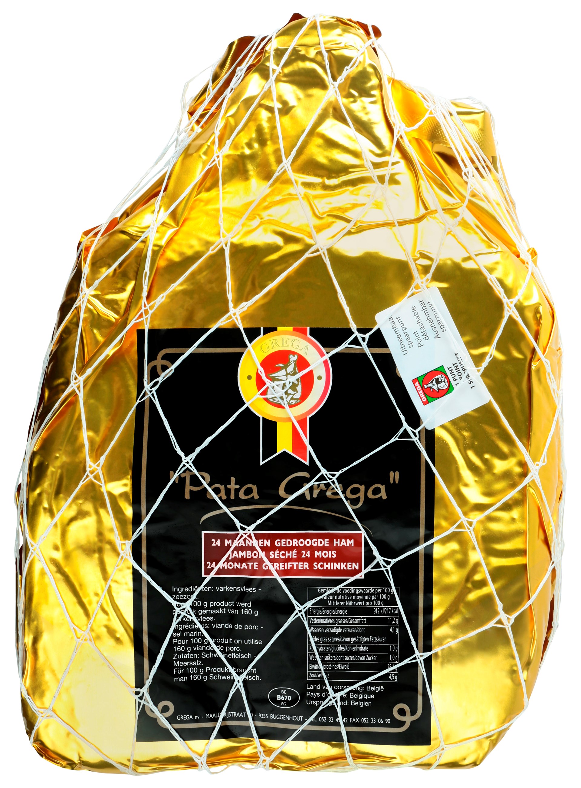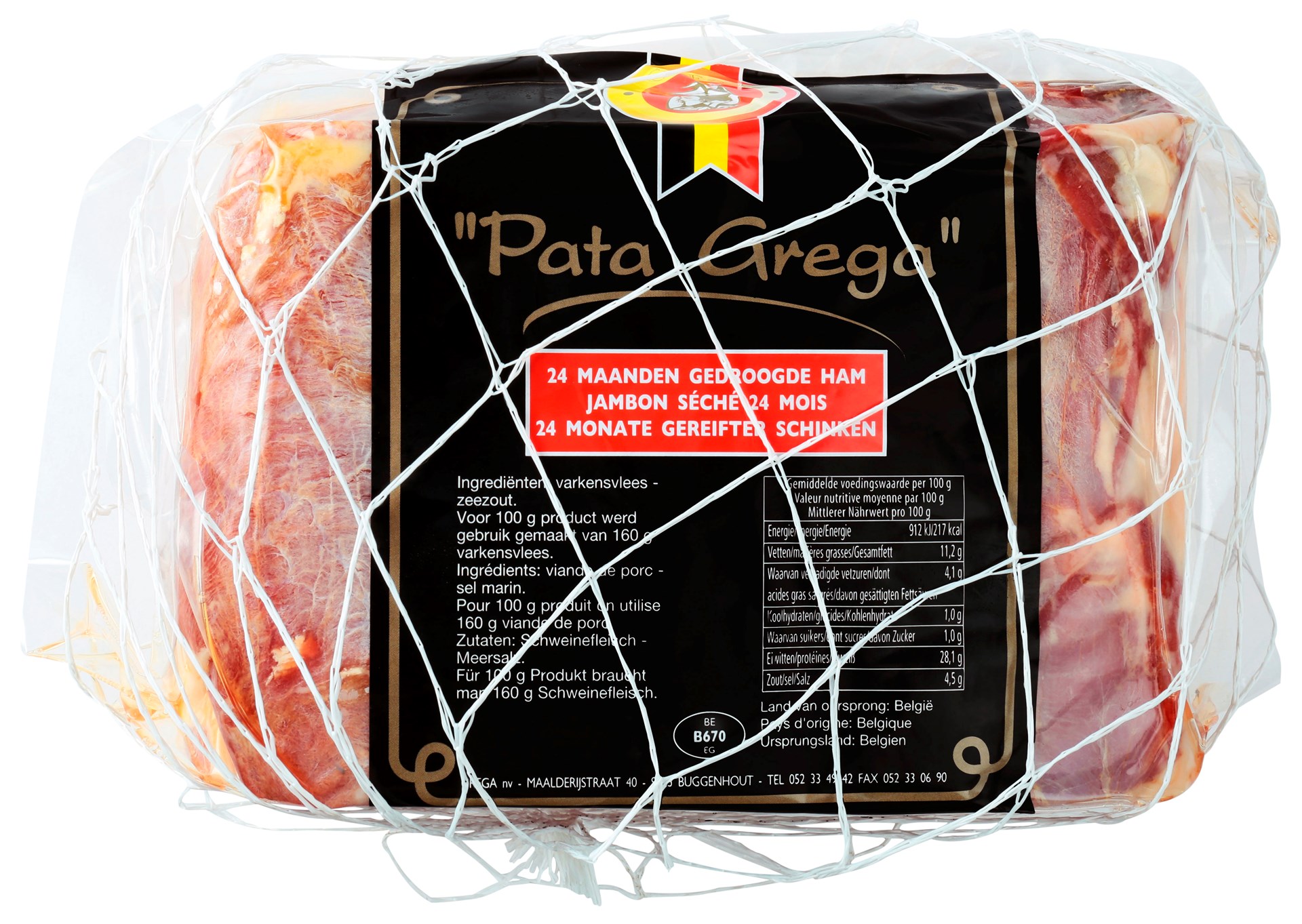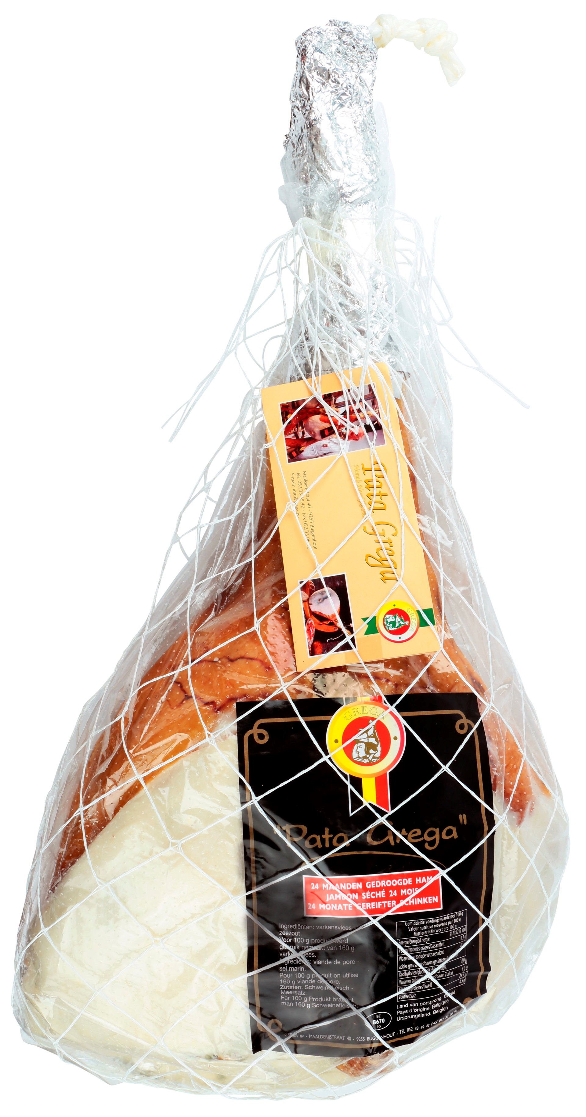 Le jambon Pata Grega, du producteur Belge GREGA (Buggenhout, Flandre-Orientale), affiné 24 mois minimum, a un goût incomparable. Séché pendant au moins 24 mois mais si tendre, ce délice délicat fond dans la bouche. Doux et savoureux en même temps, grâce au savoir-faire et aux procédés rigoureux de salage, repos, séchage... Une jouissance des papilles gustatives !