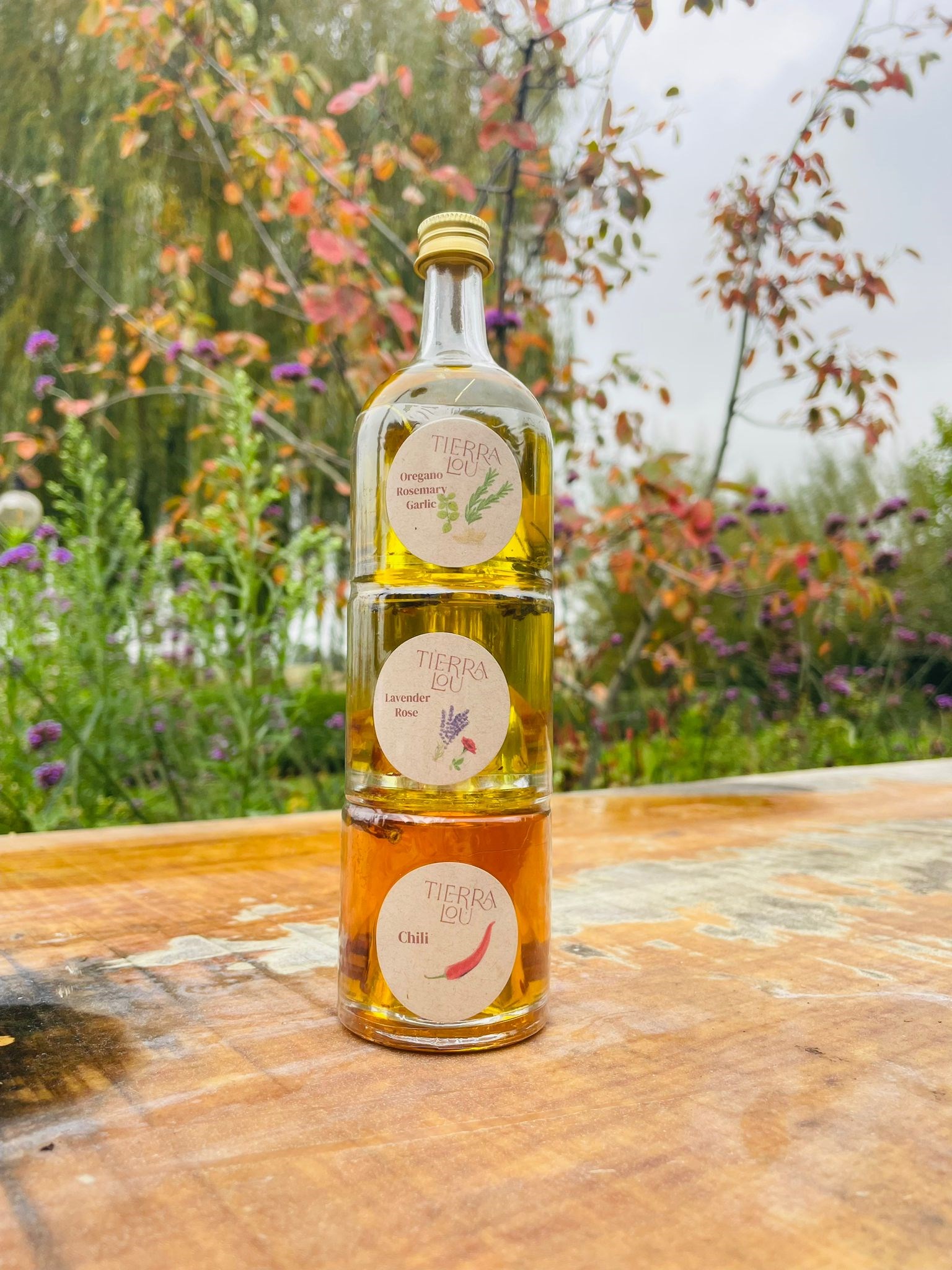 Trois bouteilles avec un mélange unique d’herbes et de fleurs, issu de notre propre inspiration. Chaque huile offre des infusions de saveurs originales pour une expérience nouvelle et innovante.