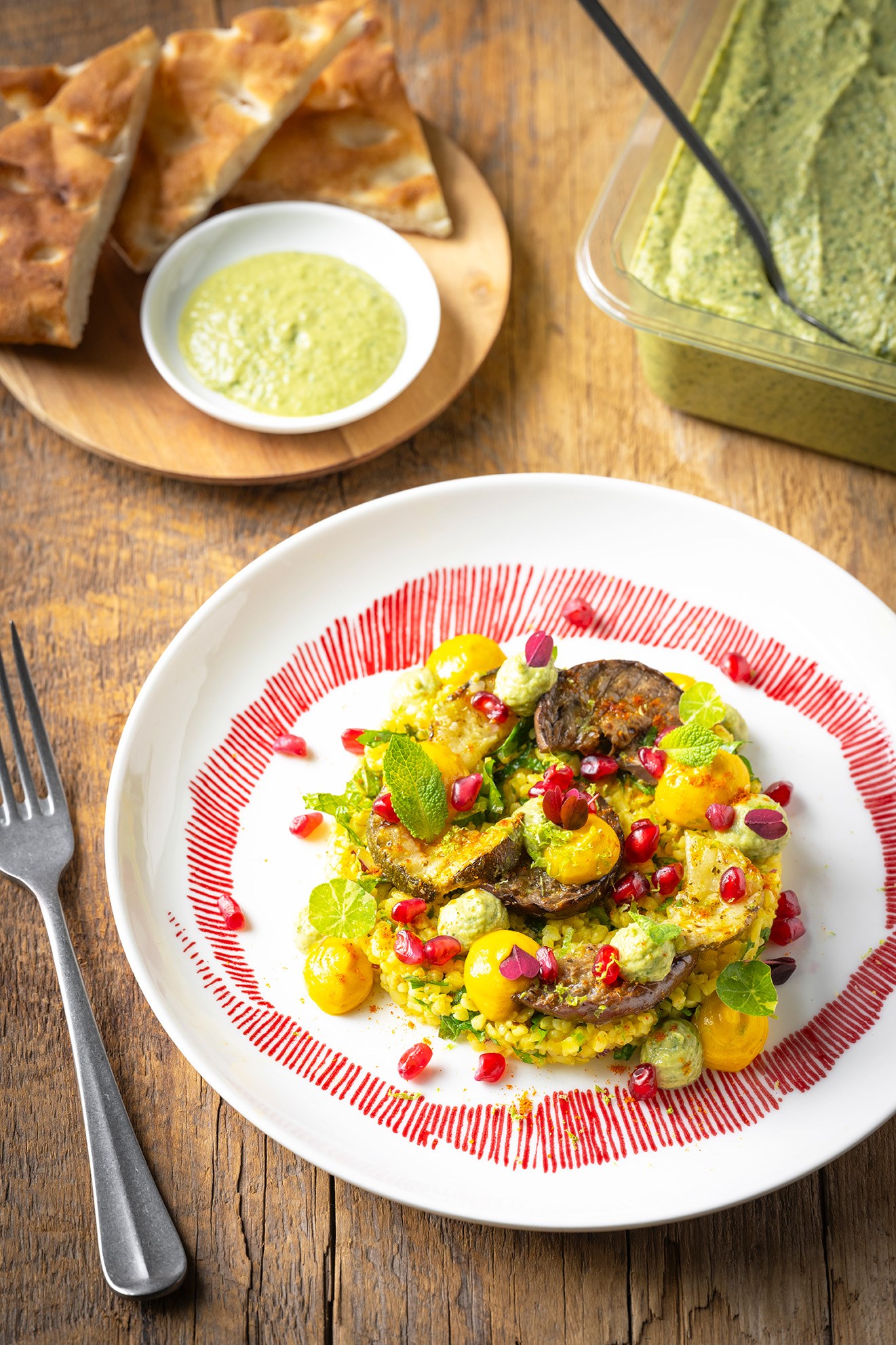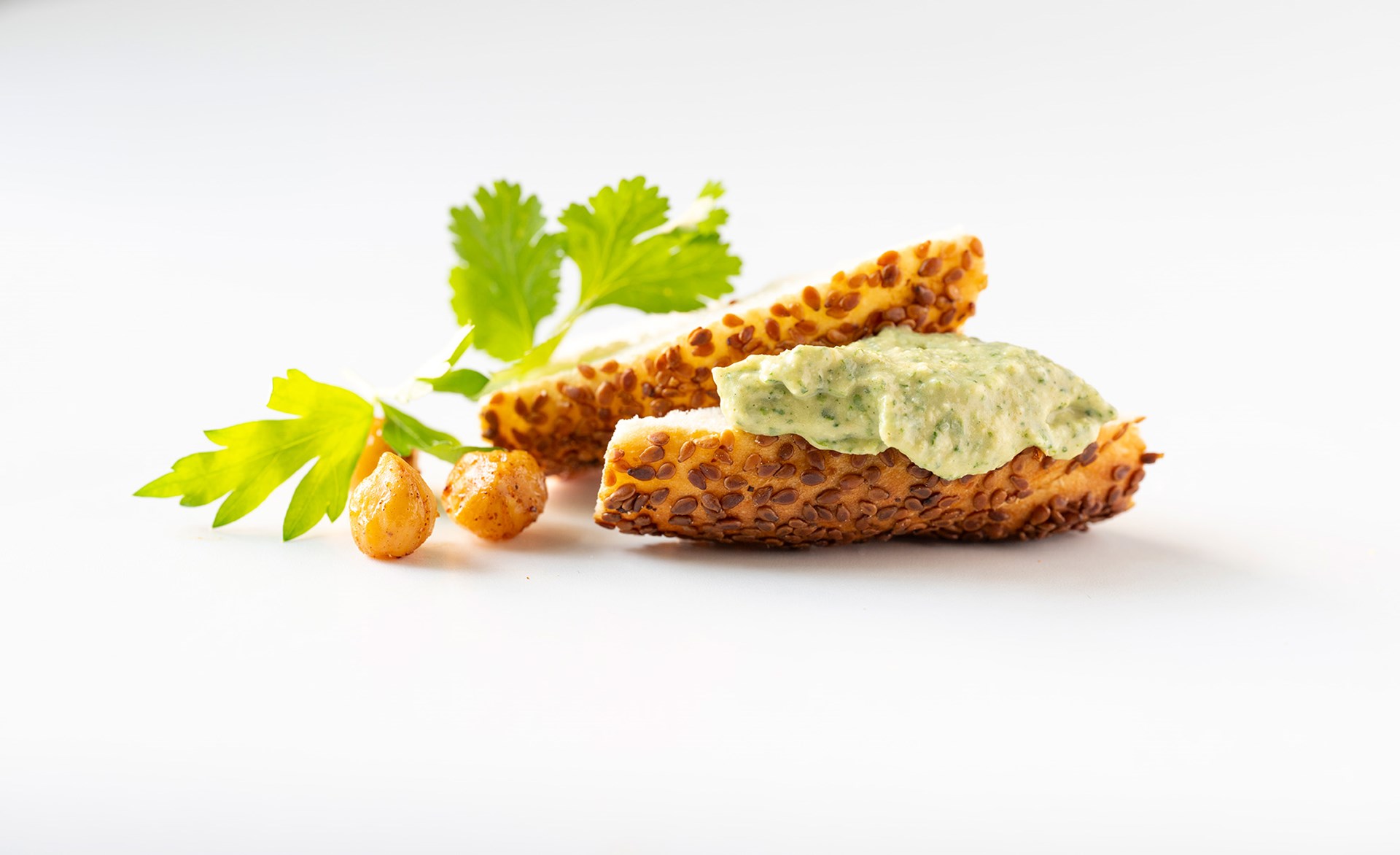Variante de houmous frais du Moyen-Orient à base de coriandre, persil, piments verts de Macédoine, ail, cardamome et herbes fraîches.
