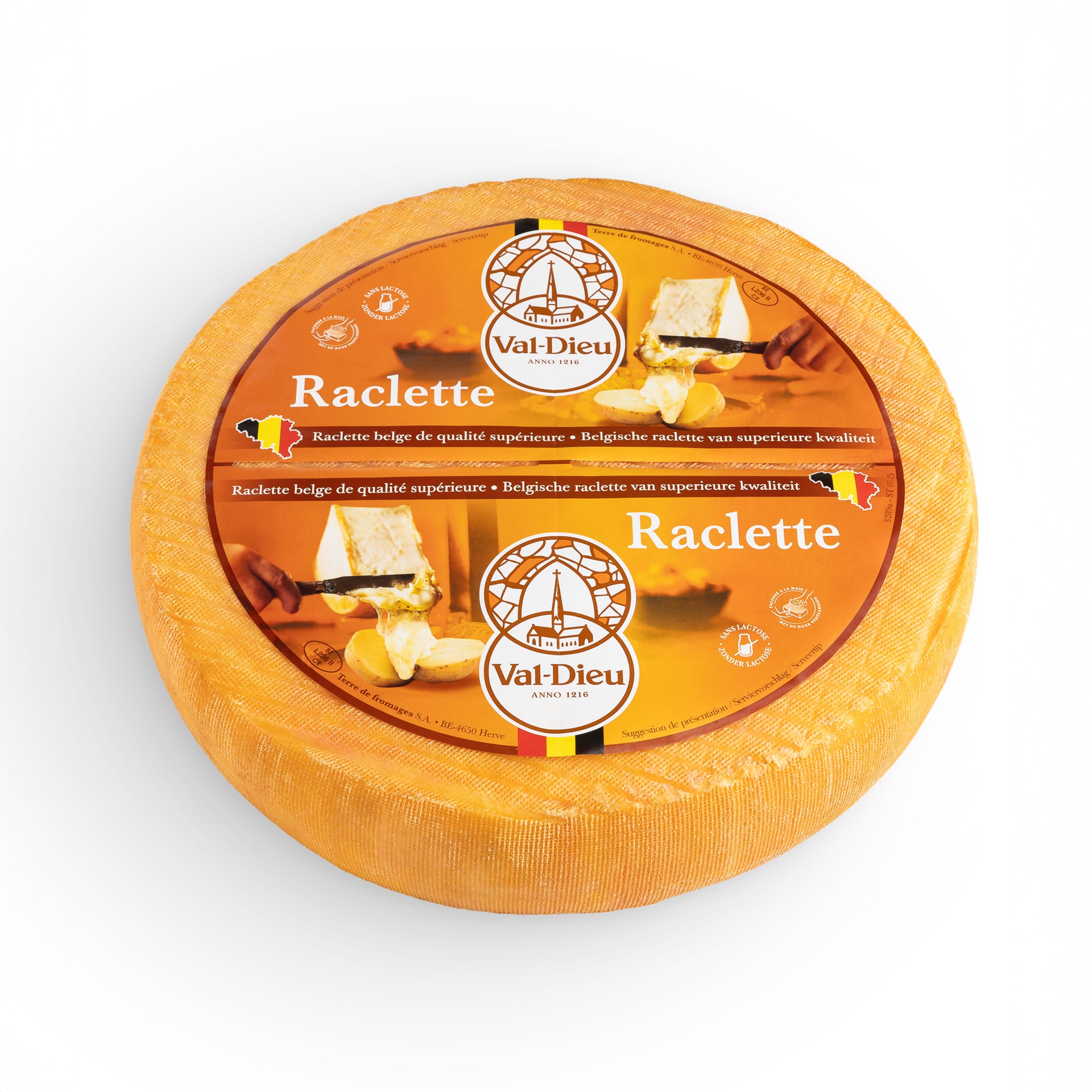 100 % Belgische raclette, gemaakt van lokale melk, Val-Dieu Raclette onderscheidt zich door zijn uitgesproken abdijsmaak, perfect gecontroleerde smelt en zijn wielvorm, ideaal voor traditionele raclette-toestellen. / Raclette 100 % belge, fabriquée à partir de lait local, le Val-Dieu Raclette séduit par son goût d’abbaye typé, sa fonte maîtrisée et son format en roue idéal pour les appareils traditionnels.