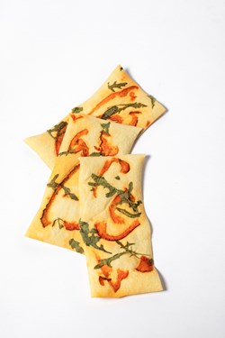 De paprika rucola crackers onderscheidt zich door het gebruik van verse rauwe groeten, wat zorgt voor een pure smaak, een fijne textuur en een natuurlijke uitstraling. Volledig handgemaakt en zonder bewaarmiddelen tilt hij het aperomoment naar een hoger, verfijnd niveau.