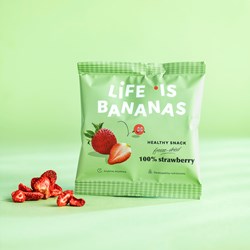Life is Bananas aardbeichips herdefiniëren gezonde snacks. Het product bestaat uit 100% gevriesdroogde aardbeien, zonder enige toevoeging. Geen toegevoegde suikers, geen concentraten, geen additieven. Die radicale eenvoud zorgt voor maximale transparantie en sluit perfect aan bij de groeiende vraag naar pure, evenwichtige voeding.