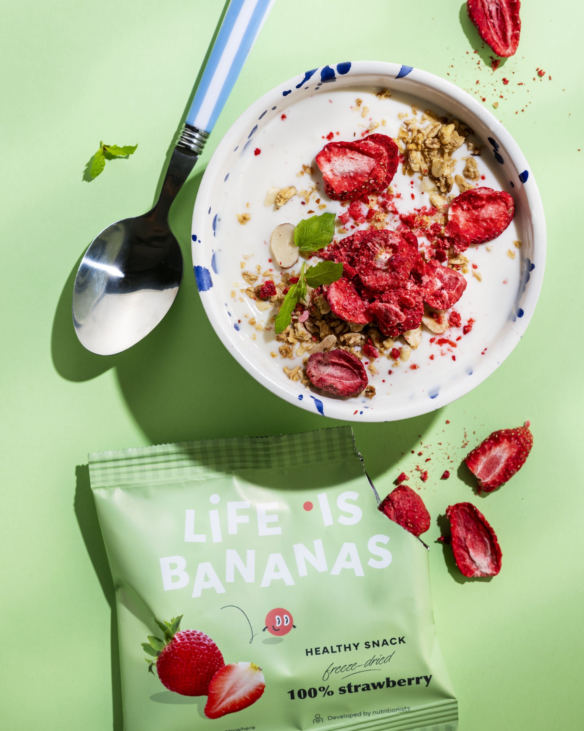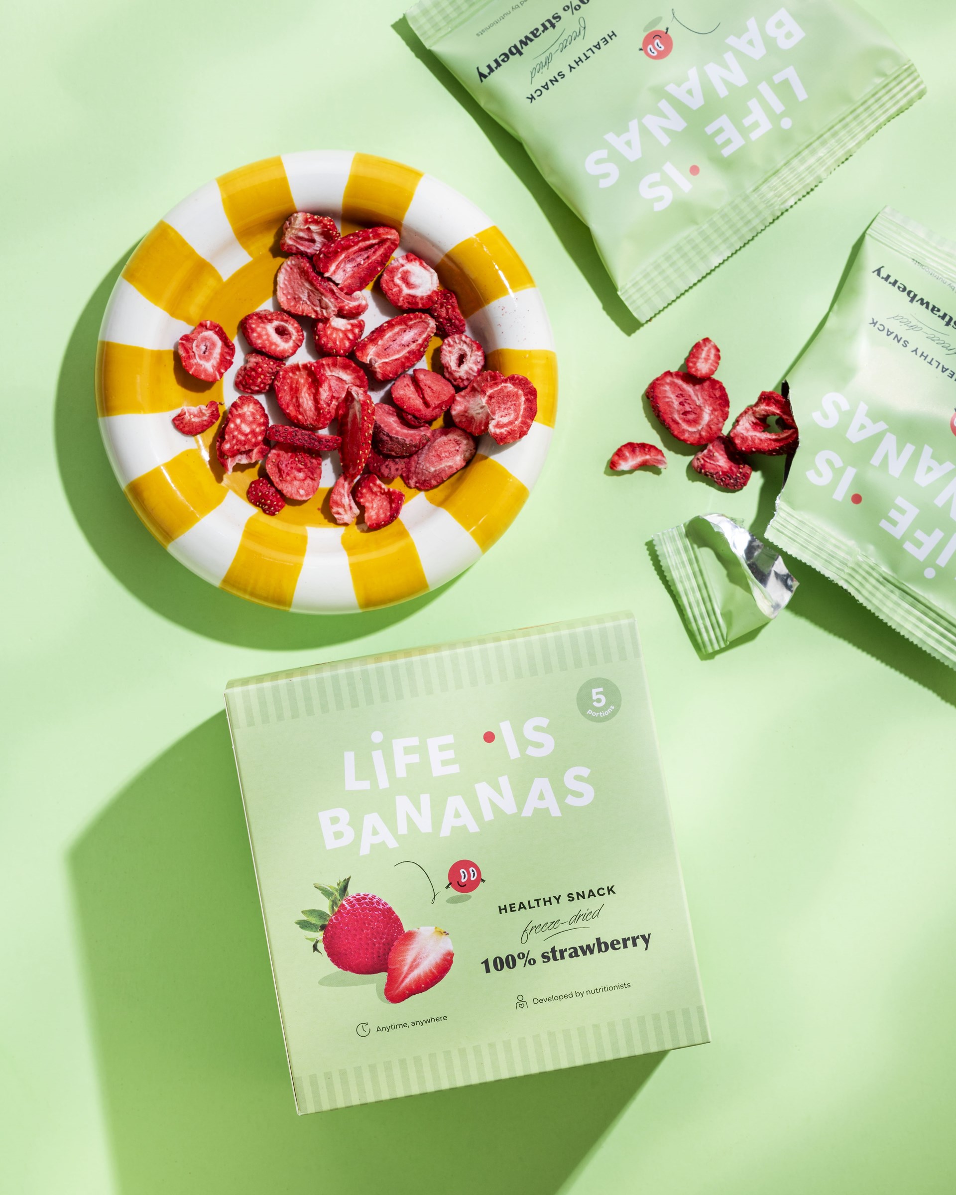 Gezond zonder lange ingrediëntenlijst – bij Life is Bananas kan het. 100% aardbei, 0% toevoegingen en een verrassende crunch. Door een slimme verwerking transformeren we puur fruit tot een nieuw snackmoment dat zich duidelijk onderscheidt van klassieke en overbewerkte snacks.
