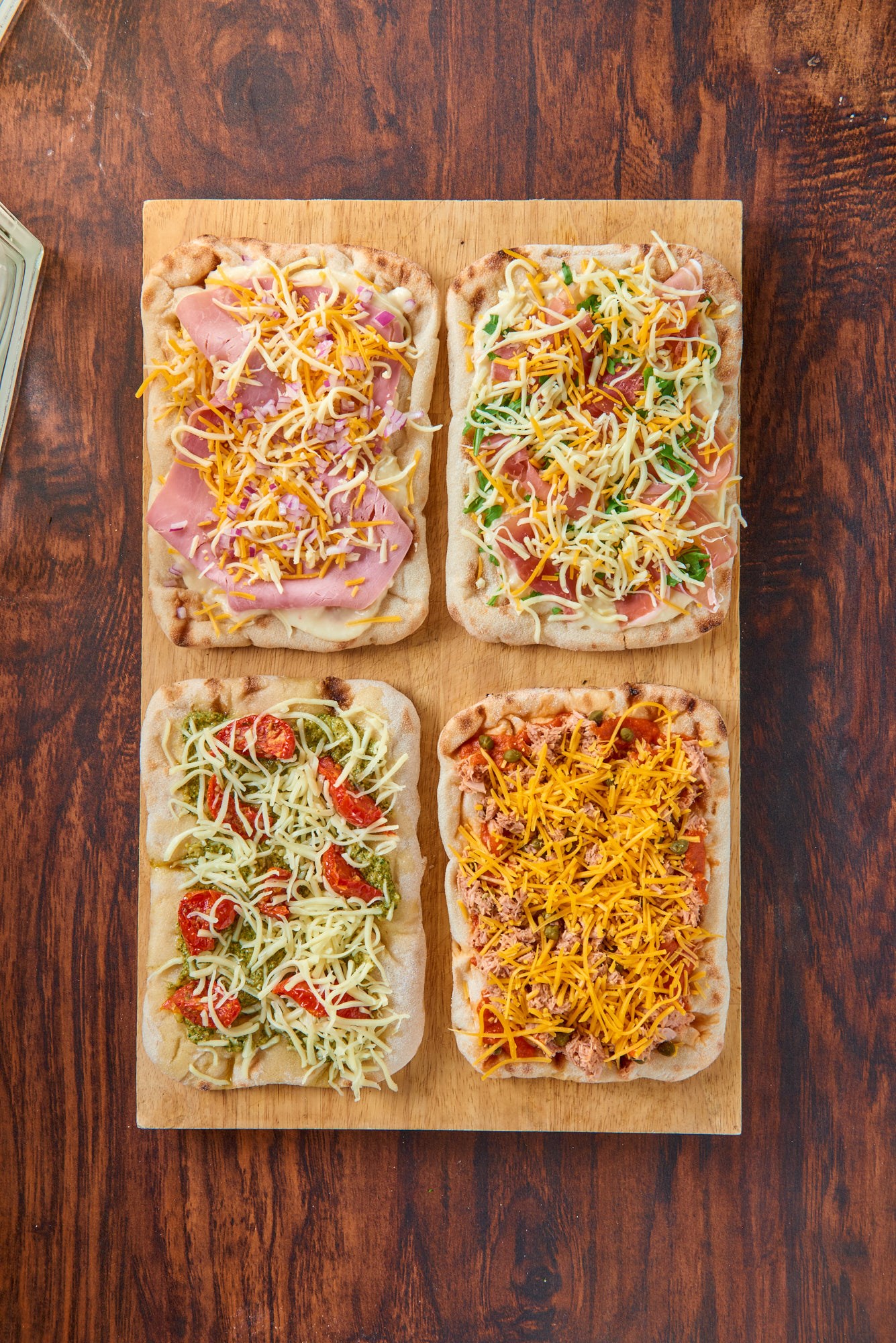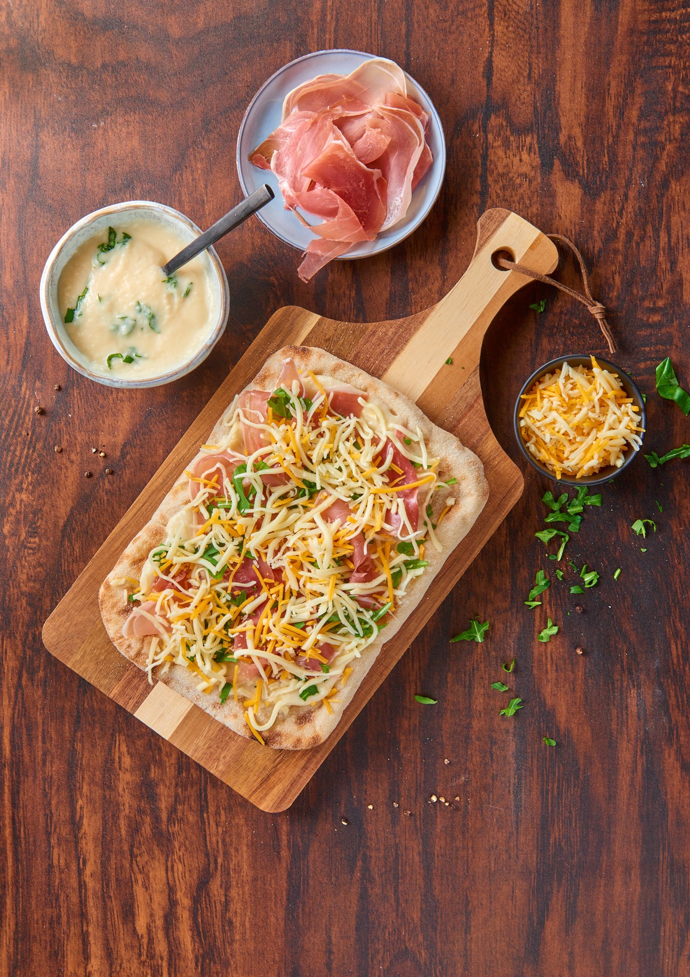 Une base de pinsa croustillante et légère venue d'Italie, à base de levain et d'huile d'olive, la véritable « Pinsa Romana » déclinée en 4 variantes et généreusement garnie : Prosciutto, Caprese (Veggie), Tonnato et Ganda Ham.