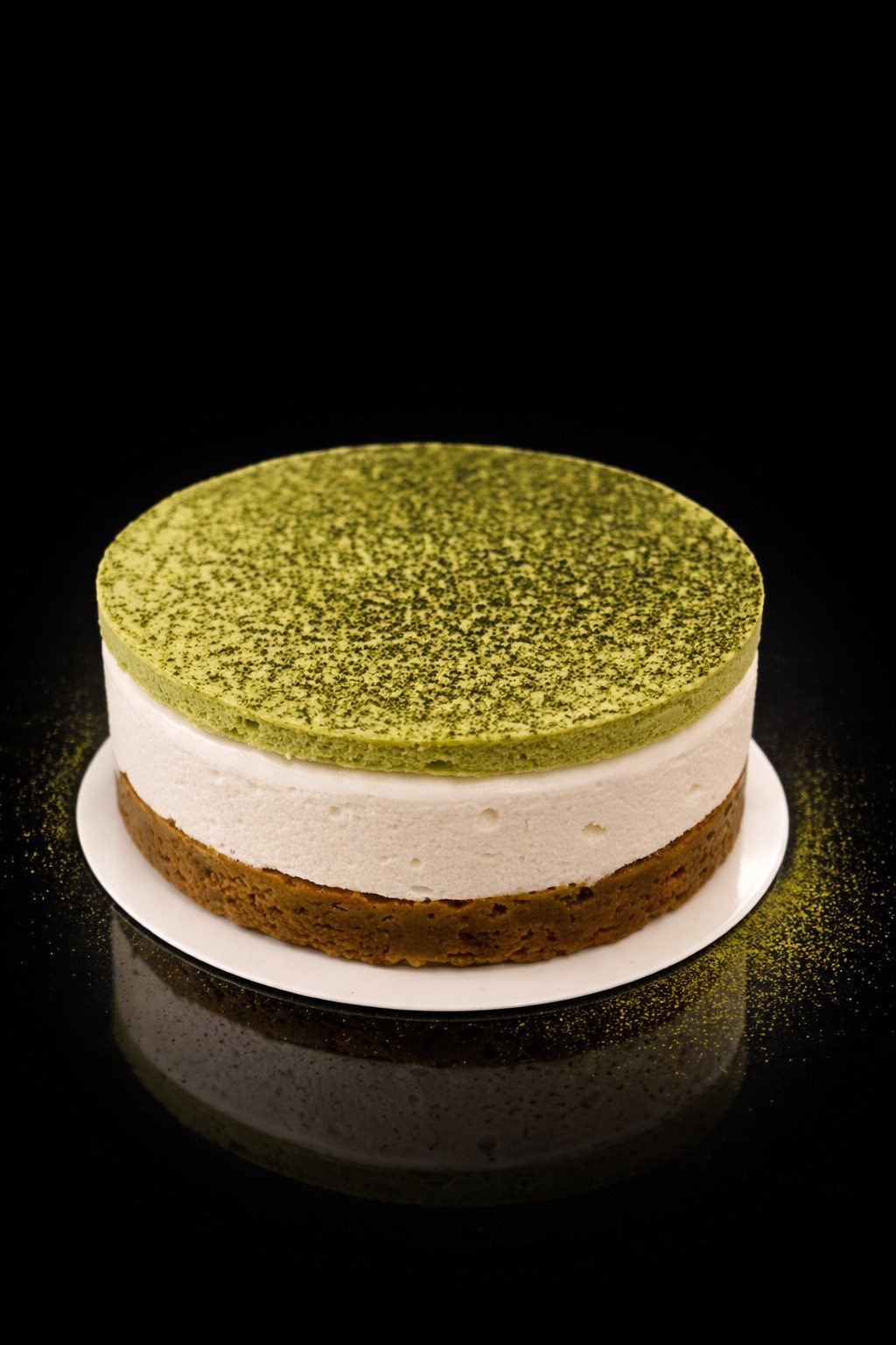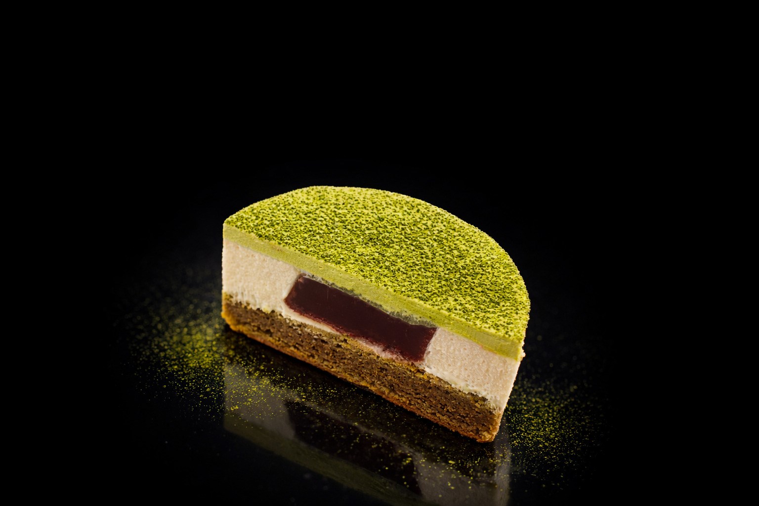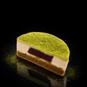 De structuur ondersteunt dit evenwicht: een delicate glutenvrije biscuit, een luchtige mousse van plantaardige chocolade en een azuki-insert die rondeur en diepte toevoegt. Een verfijnde matcha-gelei en een strak spiegelglazuur ronden het geheel af met een elegante bitterheid en een hedendaagse esthetiek.