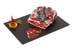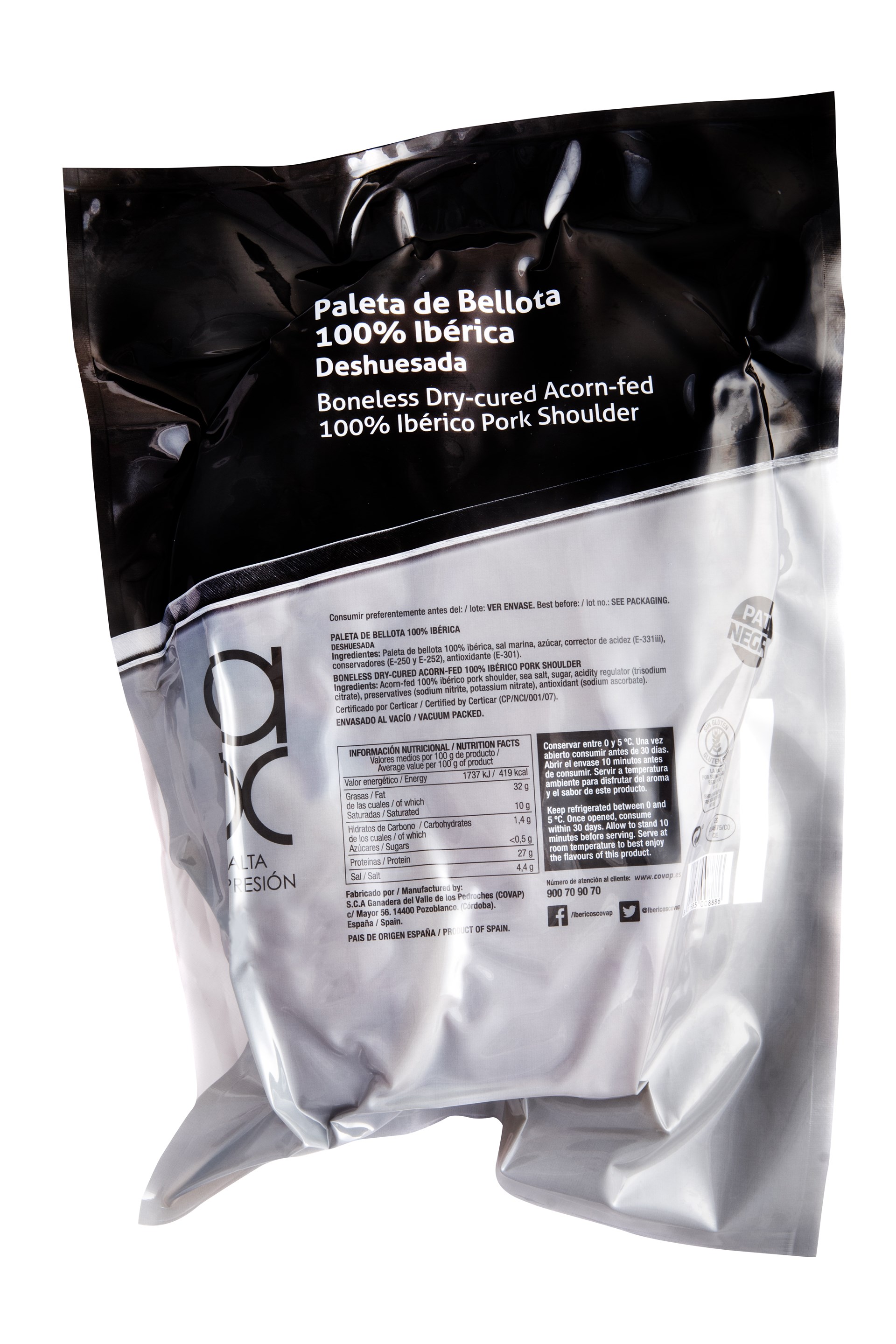 The Shoulder has been subjected to a long aging process in our own natural drying houses for a minimum of 18 months. This guarantees its excellent flavor and intense aroma. The piece shows the characteristic marbling due to the oleic acid provided by its diet of acorns.