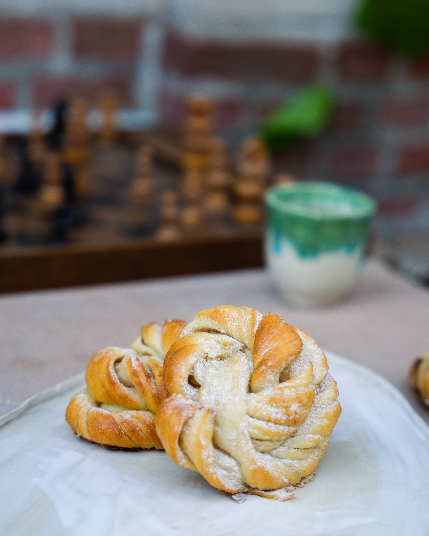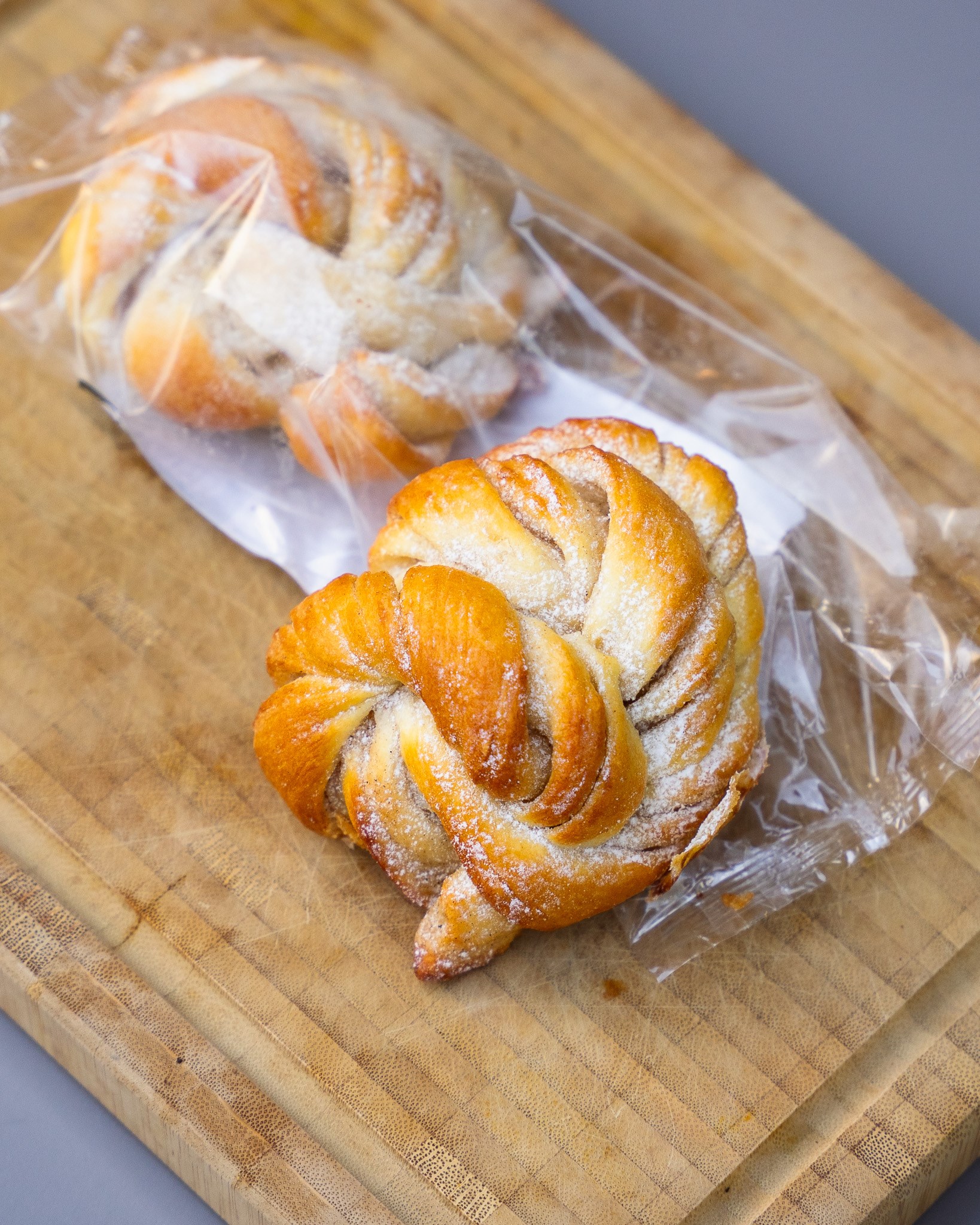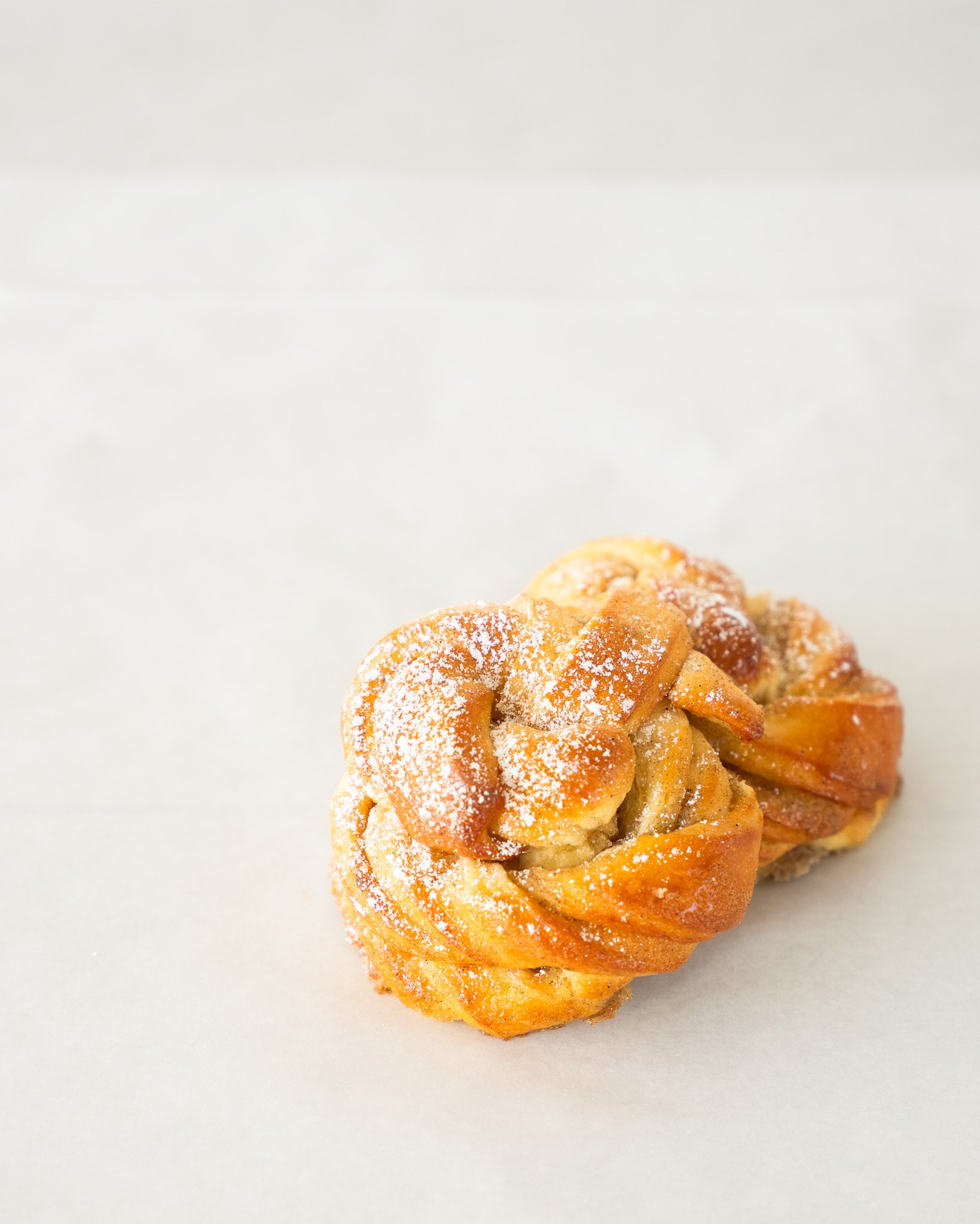 Een Scandinavische klassieker met een verfijnde twist. Ons zachte briochedeeg wordt uitgerold en besmeerd met een mengsel van 100% kardemom, suiker en boter. Na het snijden worden de stukken deeg met de hand geknoopt tot elegante buns en gebakken tot ze goudbruin zijn. Het resultaat is een zacht, licht kruidig en typisch Scandinavisch gebak met een warme en elegante kardemomsmaak.