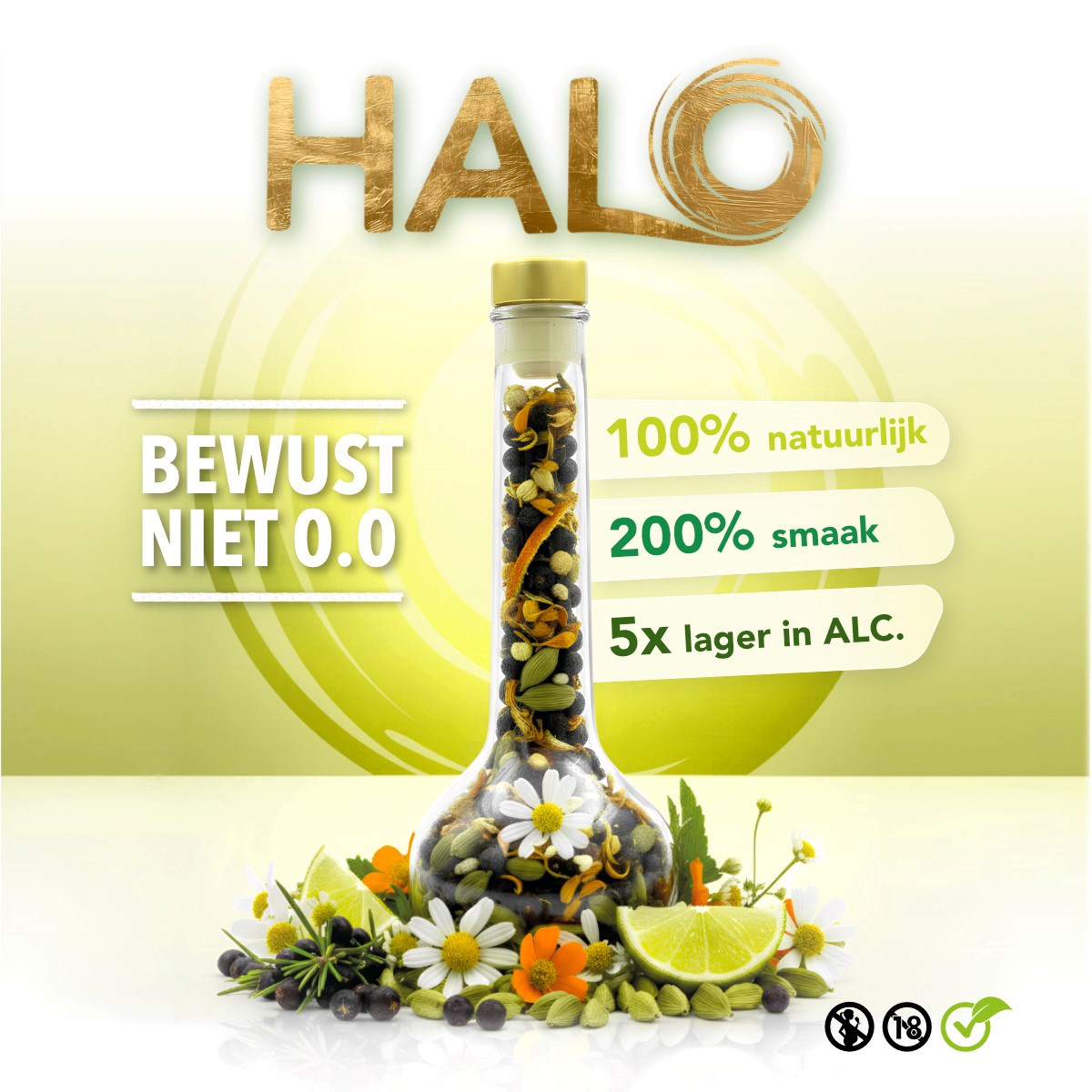HALO is een nieuw aperitief met de echte smaak van gin, in een kruidige en een citrus variant, maar laag-alcoholisch: Een HALO & Tonic heeft<2% alcohol, maar de echte volle smaak. Kom dat proeven!