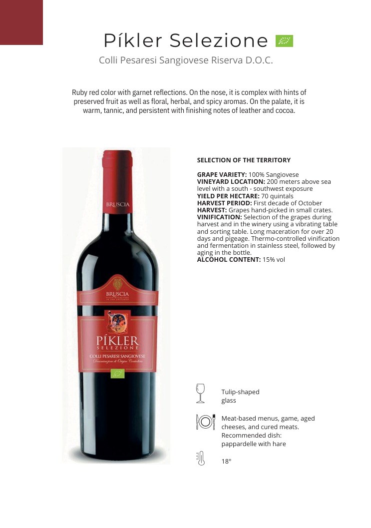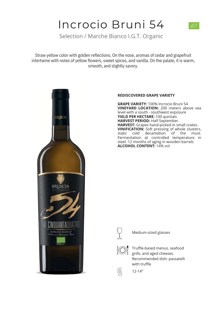 Cantina Bruscia produceert biologische wijnen op de heuvels van Pesaro-Urbino, met uitzicht op de Adriatische Zee in de Italiaanse regio Marche. Met vier generaties wijnbouwervaring richt het domein zich op inheemse druivenrassen zoals Bianchello del Metauro en Sangiovese, evenals zeldzame herontdekte variëteiten zoals Incrocio Bruni 54. De wijnen weerspiegelen het karakter van het Adriatische terroir met frisheid, elegantie en een uitgesproken gastronomisch profiel.